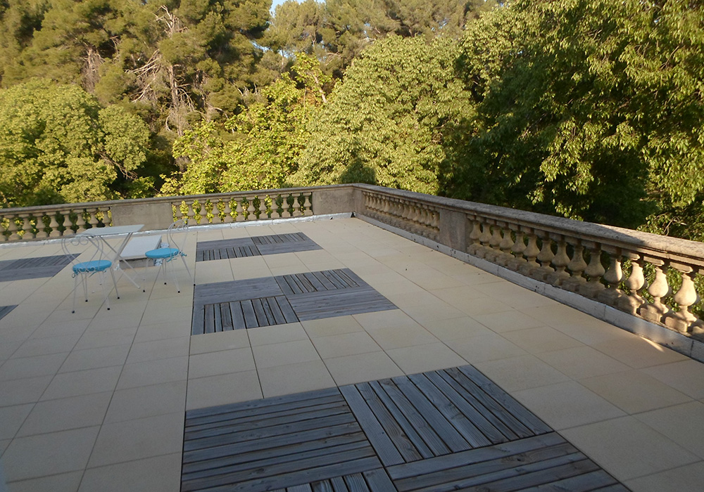 Elle offre 4 ouvertures et 2 portes-fenêtres, qui donnent sur une terrasse de 100 m2 avec balustrade de pierre.